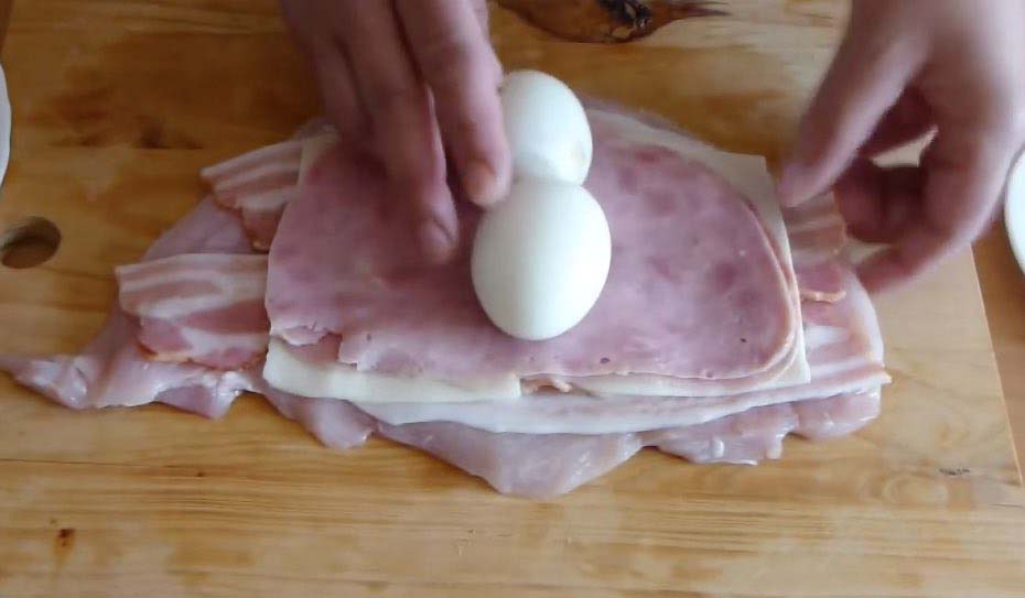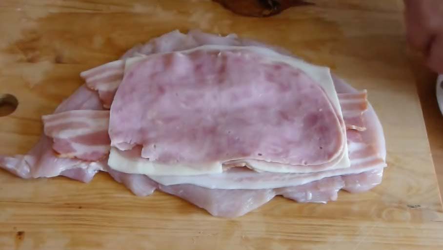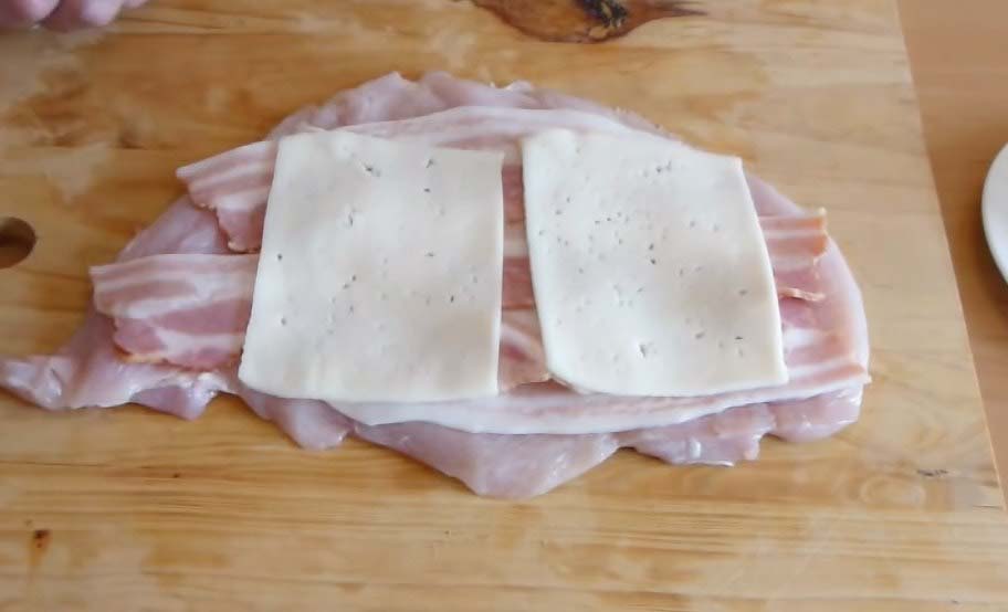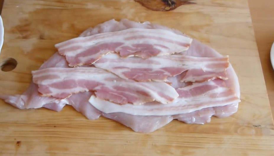 - Coloca el bacón/tocino de manera uniforme encima de la pechuga.