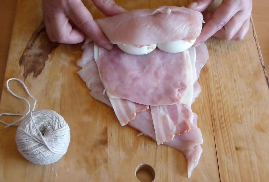 - Enrolla con cuidado, para que los huevos no se salgan por los lados. Ata el pollo de la manera como se indica en la foto. Una vez hecho esto, añádele los condimentos que desees.