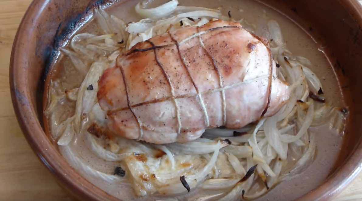 - Coloca el pollo en una bandeja para hornear, agrégale un poco de vino blanco y cebolla picada. Envíalo al horno precalentado a 190°C por 55 minutos, o hasta que el pollo empiece a dorarse.