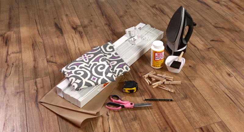 4. A continuación, procede a pegar cuidadosamente los listones y la propia cornisa sobre la tela. No es necesario pegar completamente los listones, basta con fijar los bordes. Utiliza pinzas de ropa para fijar bien la tela y detalles de diseño.