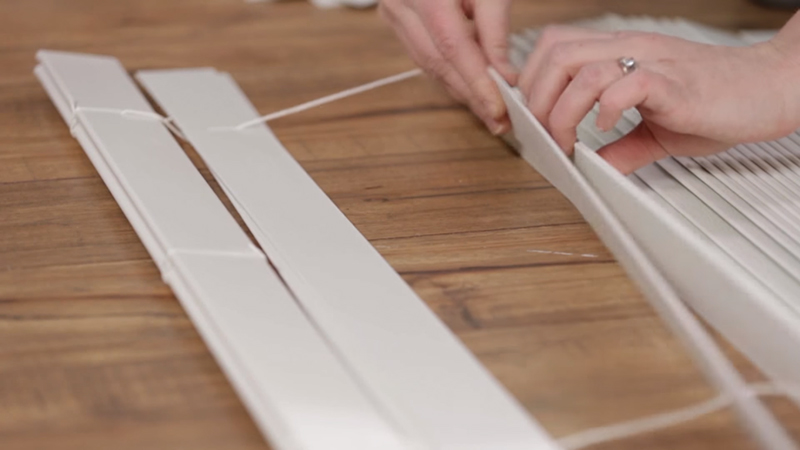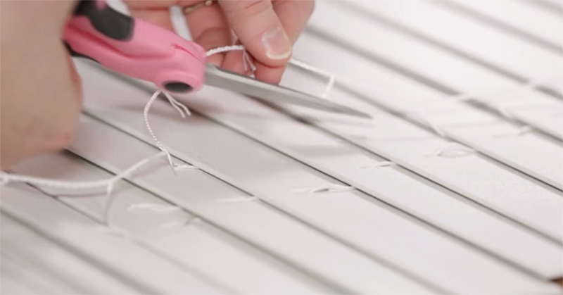 2. Luego debes cortar las cuerdas pequeñas entrecruzadas, para que la cuerda longitudinal principal se mantenga intacta, ya que ella servirá de soporte para las futuras persianas romanas. A continuación, retira la mayor parte de los listones horizontales, dejando intactos solamente la cornisa, 7 listones transversales para el marco y dos cuerdas.