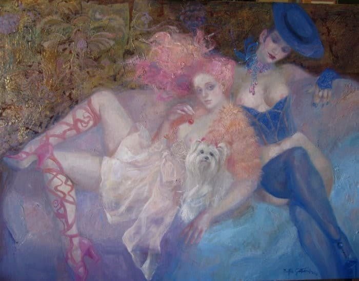 La temática de sus pinturas básicamente es la imagen de mujeres ostentosas y semidesnudas.