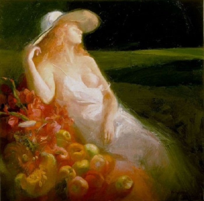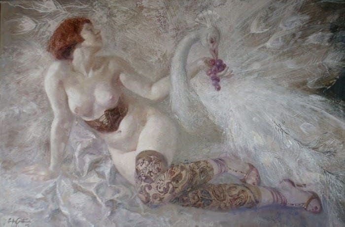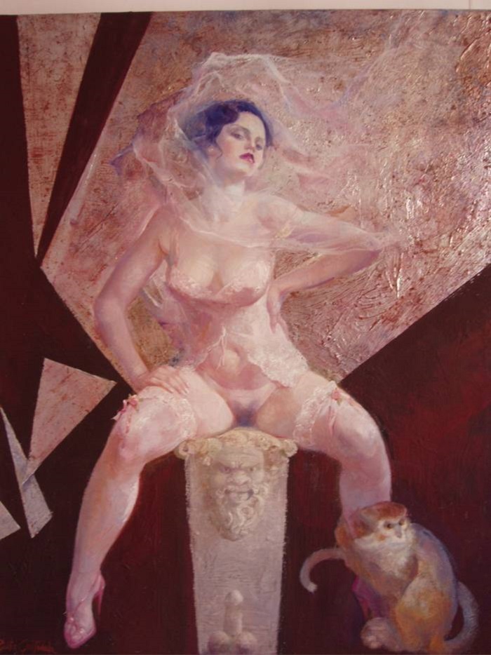 La temática de sus pinturas básicamente es la imagen de mujeres ostentosas y semidesnudas.