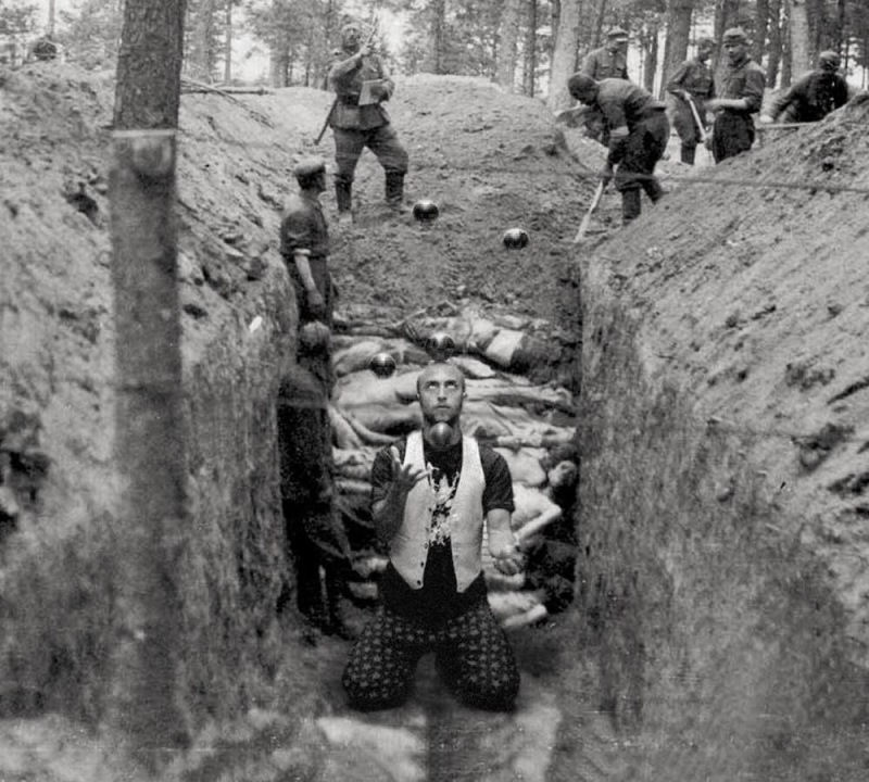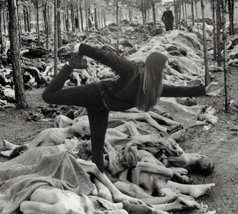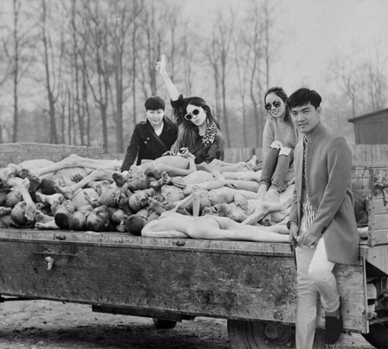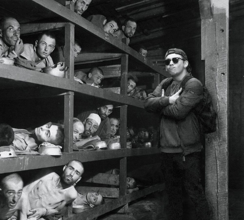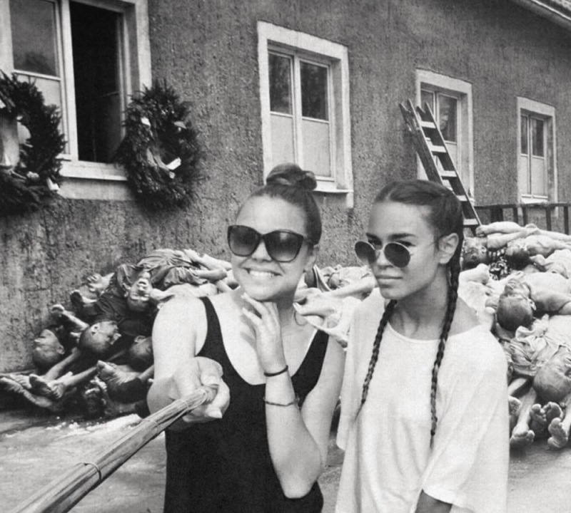 Hoy día, cientos de turistas llegan aquí para hacerse tontas selfies, y los ciclistas y los patinadores, a menudo, realizan acrobacias… ¡directamente sobre las losas de hormigón del monumento! Para mostrarle al mundo esta descomunal blasfemia, el artista israelí Shahak Shapira recopiló en las redes sociales atroces y ridículas imágenes, tomadas cerca del monumento a los héroes, y… las «trasladó al pasado», a los antecedentes históricos.