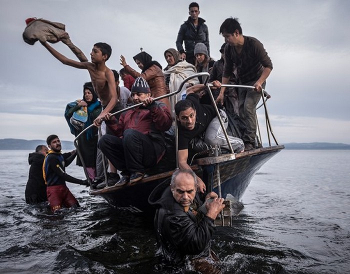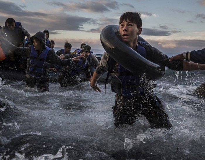 Los refugiados que han venido de Turquía en una balsa de goma desembarcan en la costa de la isla de Lesbos durante una tempestad. Asustados de que la balsa se volque, algunos de ellos están saltando al agua fría para llegar a la costa por sí mismos. (The New York Times / Tyler Hicks — octubre 1, 2015.)