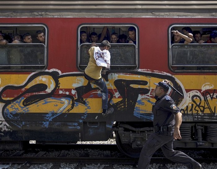Un policía procura detener a un refugiado que está subiendo a un vagón del tren por la ventana. Es la estación de Gevgelija en Macedonia, cerca de la frontera con Grecia. (Thomson Reuters / Stoyan Nenov — agosto 15, 2015.)