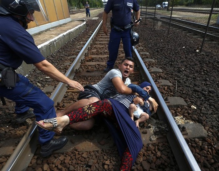 Los policías húngaros han rodeado a la familia cuyos miembros se han tirado a las vías del tren cuando fueron detenidos en la estación de la ciudad de Bicske. (Thomson Reuters / Laszlo Balohg — septiembre 3, 2015.)