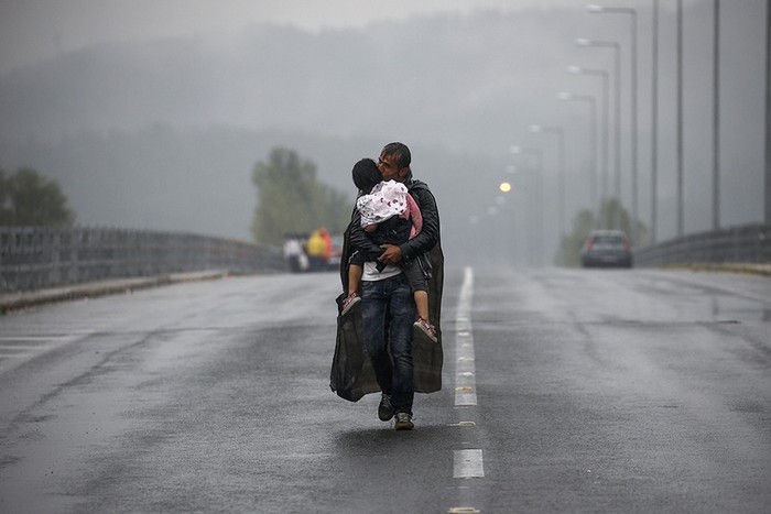 Un sirio está besando a su hija en la carretera durante la tormenta. La foto fue tomada cerca del pueblo de Idomeni, en la frontera entre Grecia y Macedonia. (Thomson Reuters / Yannis Behrakis — septiembre 10, 2015.)