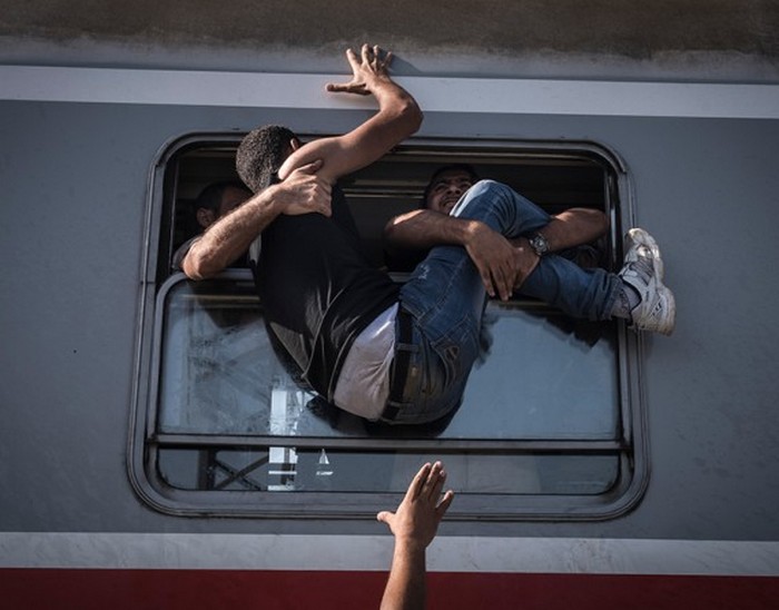Desesperados, los refugiados procuran subir al vagón por la ventana. El tren sale para Zagreb de la estación de Tovarnyak en la frontera de Serbia. (The New York Times / Serguey Ponovaryov — septiembre 18, 2015.)
