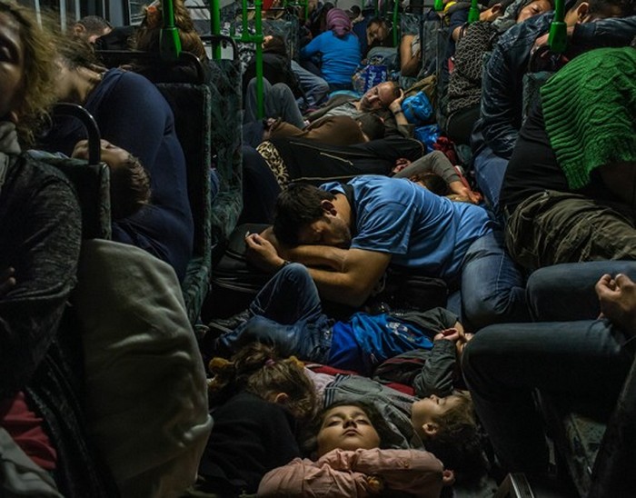 Ahmad Majid (el hombre de la camiseta azul en el centro) está durmiendo en el pasillo del autobús al lado de sus hijos. A su derecha, vestido del jersey verde, está su hermano y otros miembros de su familia, junto a una decena de otros refugiados. La foto fue tomada en el autobús que salió de Budapest para Vena. (The New York Times / Mauricio Lima — septiembre 5, 2015.)
