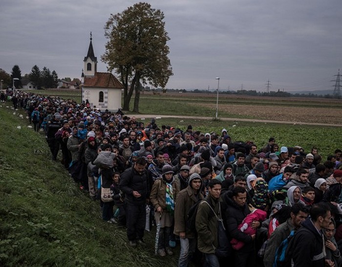 Los migrantes, acompañados por la policía eslovena se dirigen al campo de inscripción que está a las afueras de la ciudad de Dobov. (The New York Times / Serguey Ponovaryov — octubre 22, 2015.)