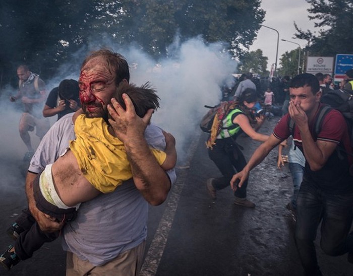 Un hombre procura rescatar a su hijo de los policías armados de unos garrotes y el gas lacrimógeno mientras están cruzando la frontera en Khorgos, Serbia. (The New York Times / Serguey Ponovaryov — septiembre 16, 2015.)