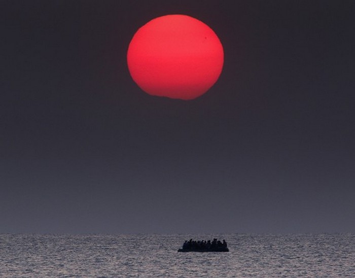 Un refugiado está agarrando muy fuerte a sus hijos para que no caigan del bote. La foto fue tomada cerca de la isla de Lesbos. (Thomson Reuters / Yannis Behrakis — septiembre 24, 2015.)
