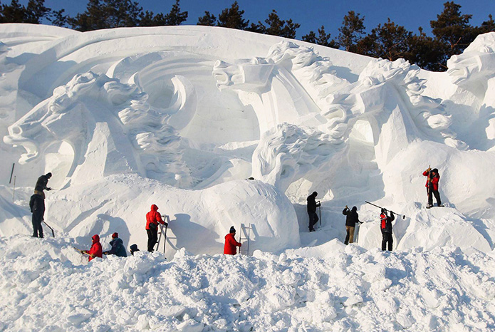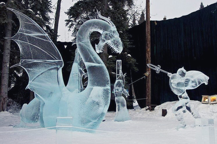 Foto de la exposición más grande del mundo de esculturas de hielo, en Alaska.