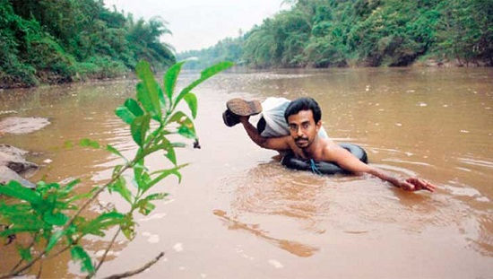 Para llegar a tiempo clase y no fallar a sus alumnos que lo esperan pacientemente, Abdul atraviesa los 100 metros que lo separan de la otra orilla del río.