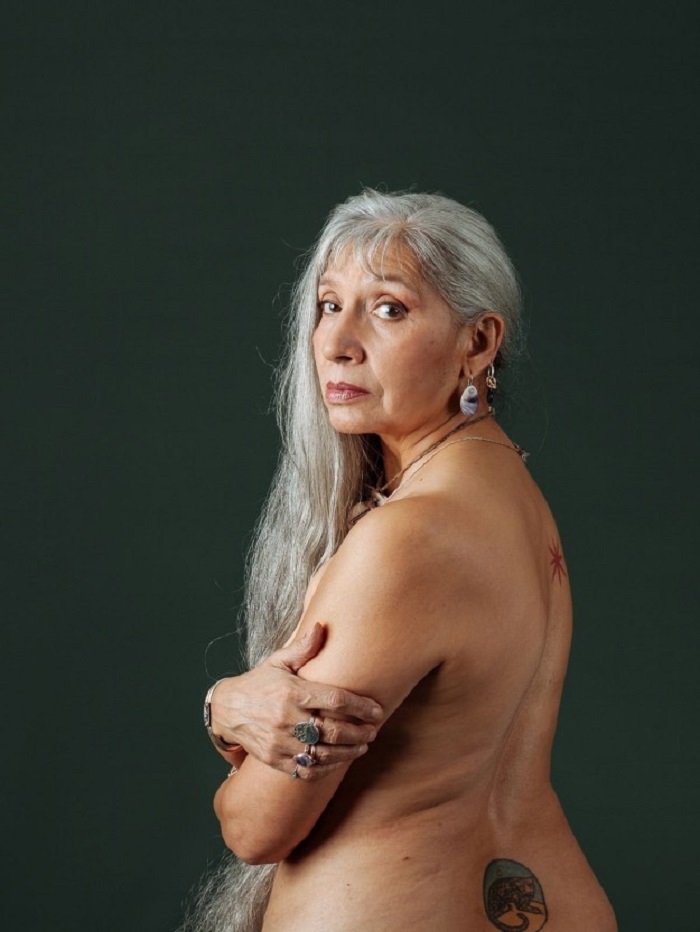 La actriz y dramaturga Monique Mojica, de 63 años de edad, mostró como luce una mujer madura que se ama a sí misma y a su cuerpo.