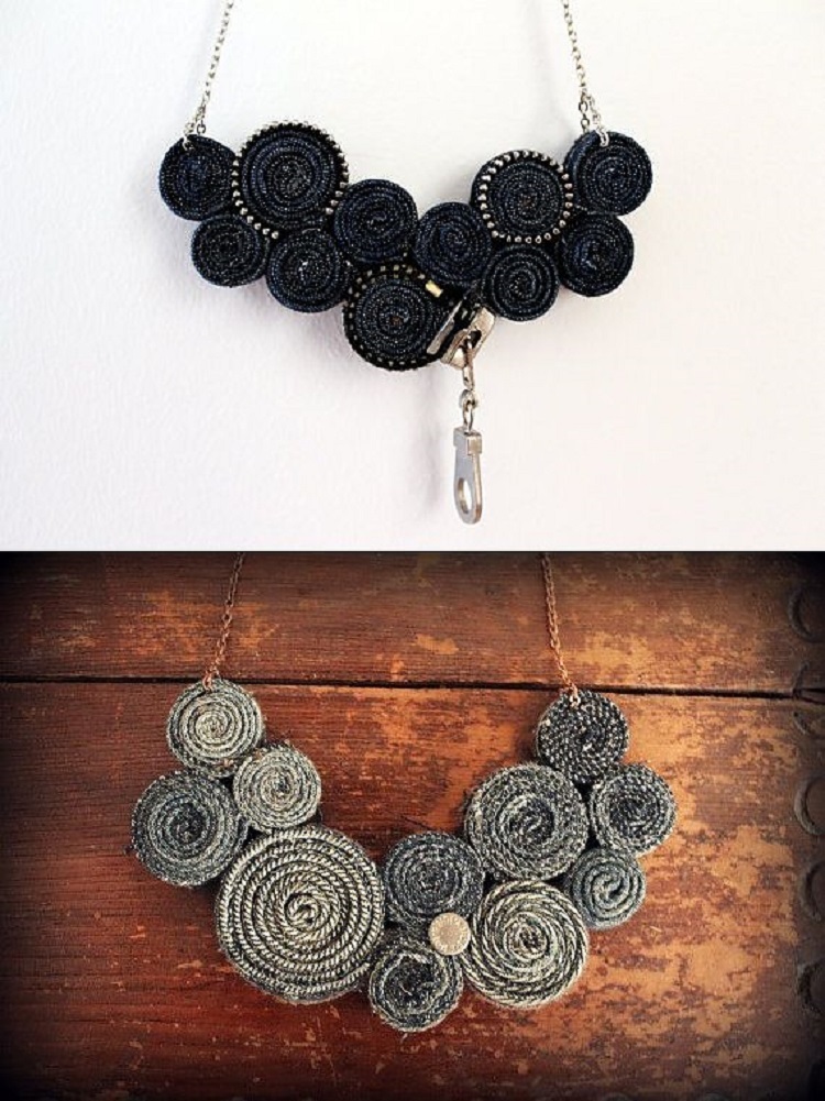 8. También se puede hacer un maravilloso collar, hecho de cremalleras de mezclilla. ¡Esta decoración será un punto culminante en tu imagen!