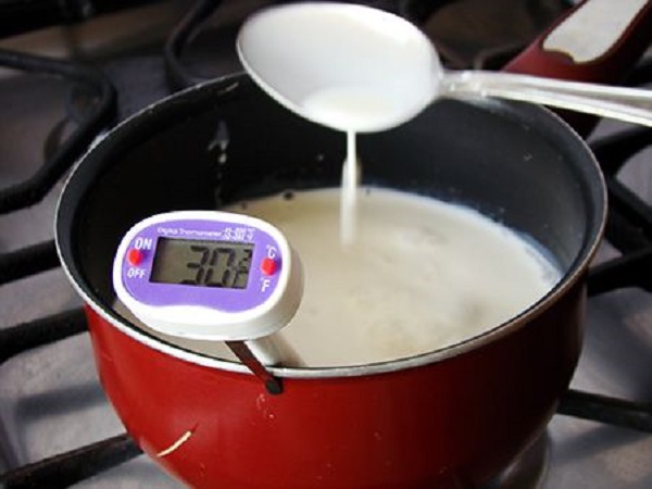 1. Vierte la crema en una cacerola limpia y seca. Si dispones de un termómetro especial de cocina, entonces puedes inmediatamente fijarlo a la sartén. Si no tienes, no te preocupes, puedes determinar la temperatura a «ojo», guiándote por tu intuición culinaria.
