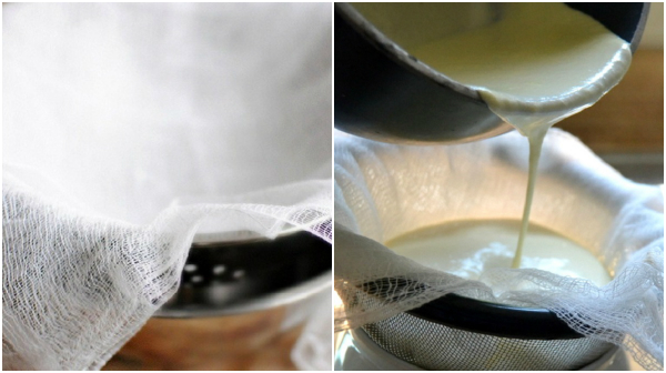 7. Cubre el colador con una gasa en 5-6 capas o un paño de lino y colócalo en una escudilla. Vierte la mezcla en un colador.
