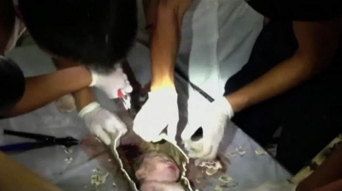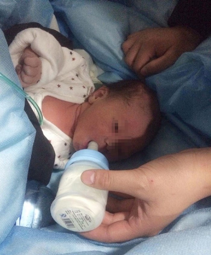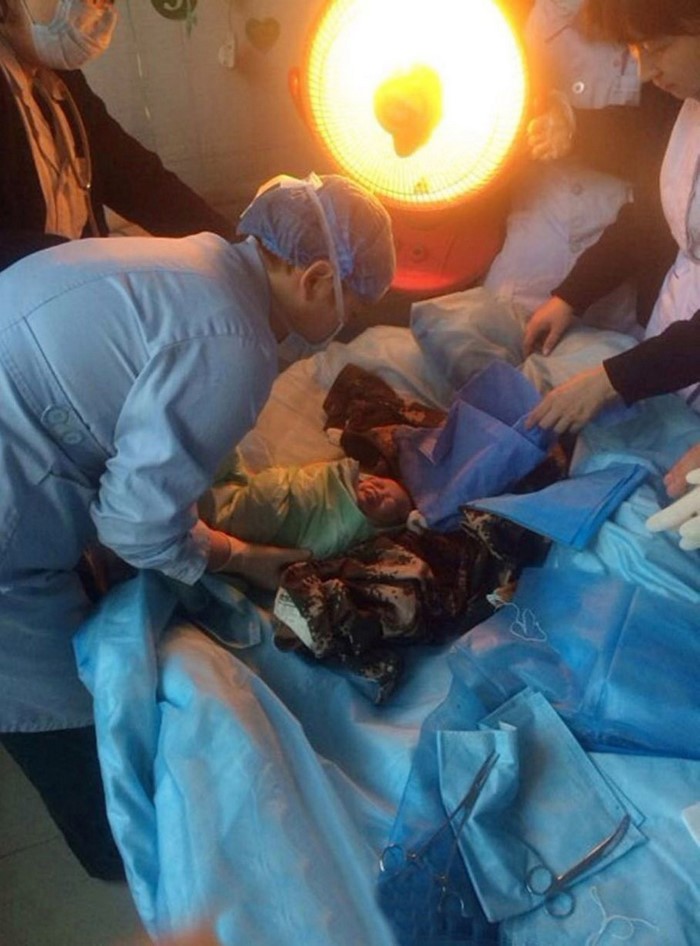 Al principio, los médicos le diagnosticaron al niño, cuya placenta estaba todavía estaba unida a su cuerpo, un problema del corazón. Además, su cuerpo presentaba numerosas contusiones y rasguños. Pero, por suerte, pronto la condición del bebé se estabilizó.