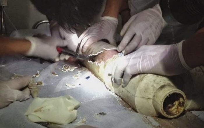 En el hospital, los médicos y el equipo de rescate, comenzaron a cortar limpiamente el tubo, con la ayuda de sierras y alicates. La operación para liberar al bebé de su cautiverio les llevó una hora, pero, finalmente, la criatura logró salir relativamente ilesa.