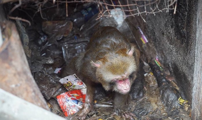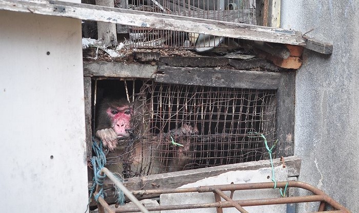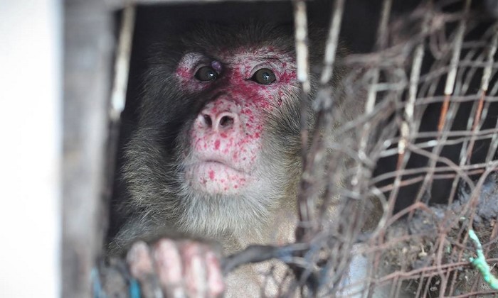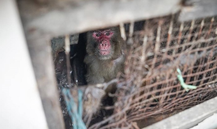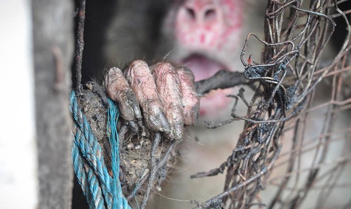 A su llegada, los equipos de rescate quedaron en shock. ¡A través de las sucias parrillas, con unos ojos casi vacíos, les miraba un macaco adulto!