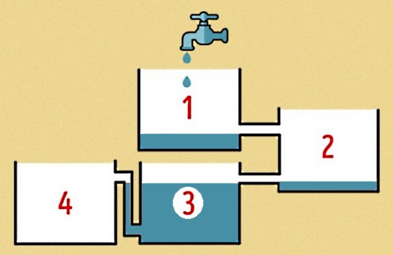3. Como todos los tanques están abiertos en la superficie, los últimos en llenarse fueron los números 3 y 4. El agua comienza a fluir entre ellos, desde los tanques números 1 y 2 hasta el final…