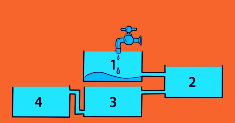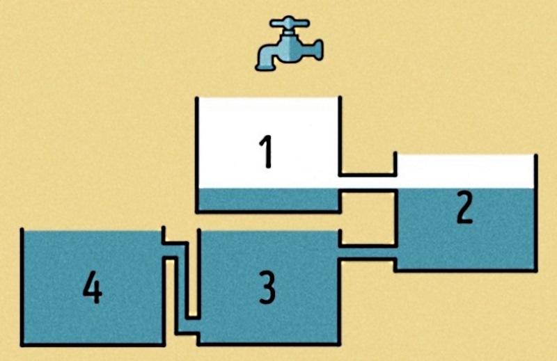 3. Como todos los tanques están abiertos en la superficie, los últimos en llenarse fueron los números 3 y 4. El agua comienza a fluir entre ellos, desde los tanques números 1 y 2 hasta el final…