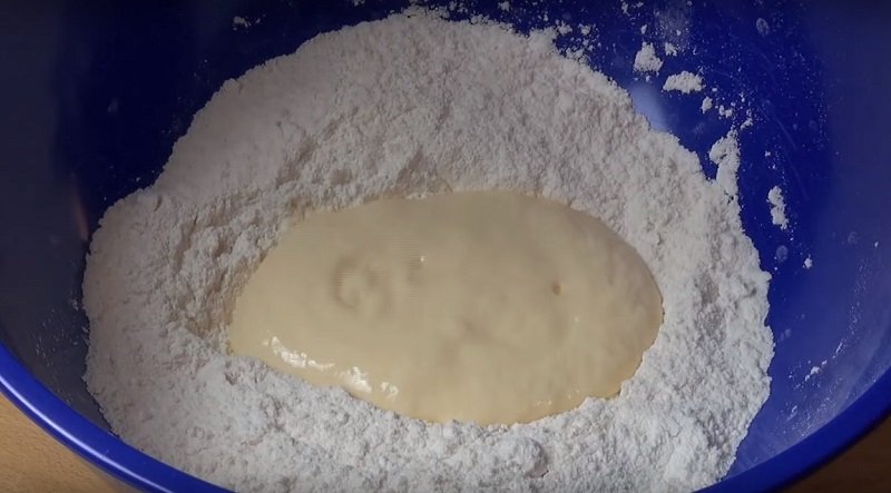 3. Vierte la masa resultante en la mezcla seca de harina, azúcar en polvo, bicarbonato y polvo para hornear.