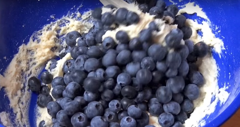 4. Añade los arándanos. Mézclalos bien con la masa. Por cierto, las bayas pueden ser sustituidas por otras, según la temporada y el gusto.