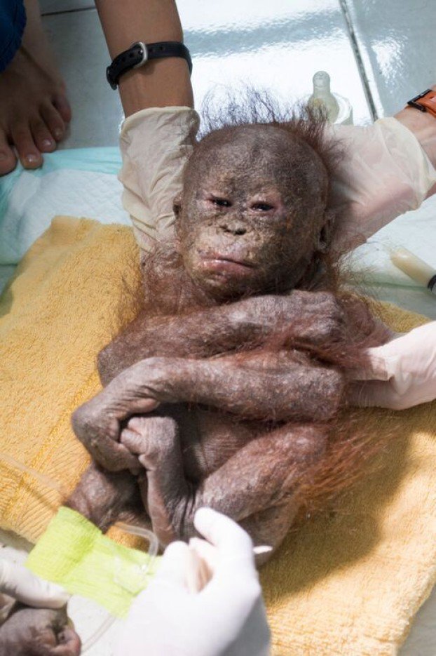 Este bebé orangután fue secuestrado de su ámbito natural por los cazadores furtivos de Indonesia y luego vendido, en calidad de mascota, al jefe de la aldea Merava, por un ínfimo precio que no superaba los 30 euros. Apenas un par de meses después, su dueño perdió completamente el interés por su mascota y lo abandonó a su suerte, en un estado moribundo.