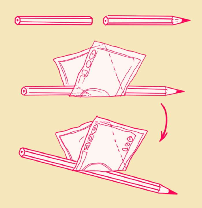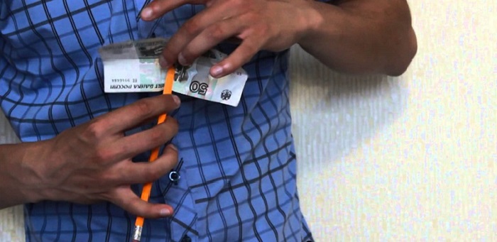 El secreto radica en el uso ingenioso del lápiz: este último se corta por la mitad en diagonal y se conecta con imanes fuertes. Esto facilita colocar el billete entre las dos mitades, de manera que se mantenga intacto.