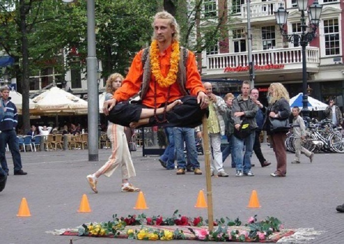 El secreto de este truco, muy popular entre los magos de la calle, se encuentra en un apoyo hábilmente oculto. Es por eso que los acróbatas que lo realizan siempre están sentados en la misma pose.