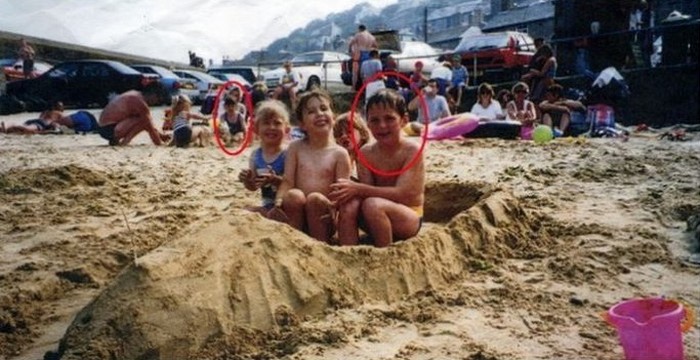 En esta imagen, el pequeño Nick había construido con sus primos un castillo de arena. Pero lo que trajo la atención de la pareja fue lo que aparecía al fondo de la fotografía. ¡Resulta que detrás de ellos aparecía la entonces pequeña Amy, rodeada de su familia!