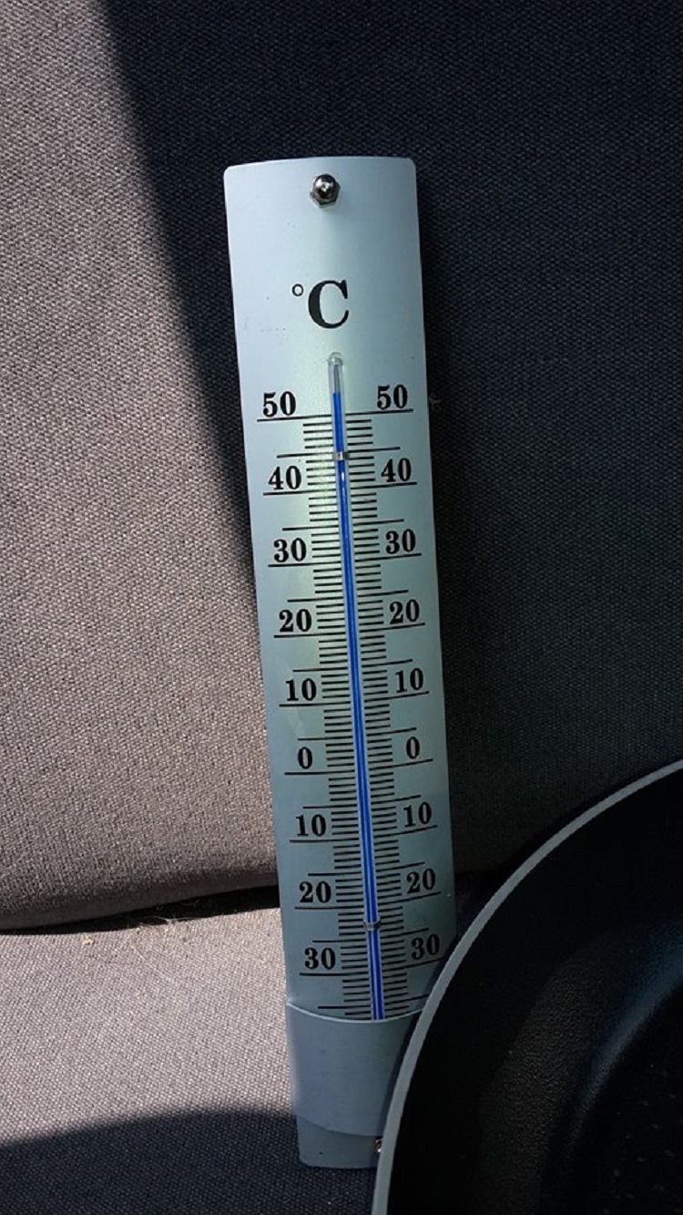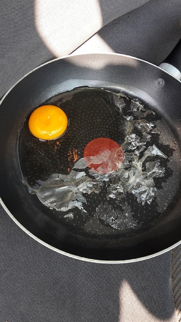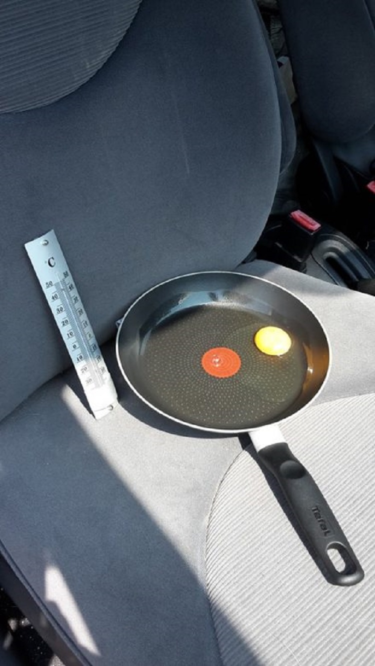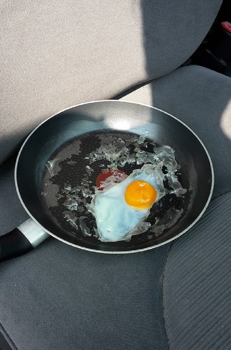 El sol no estaba muy activo ese día, pero eso no impidió que los huevos «se asaran» al calor dentro del coche. Requirió menos de 15 minutos para que el plato estuviera cocido. En tal ambiente, puede ocurrir una interrupción de la función cerebral o la muerte por un golpe de calor o hipertermia – cuando la temperatura corporal rebasa los 40°C.