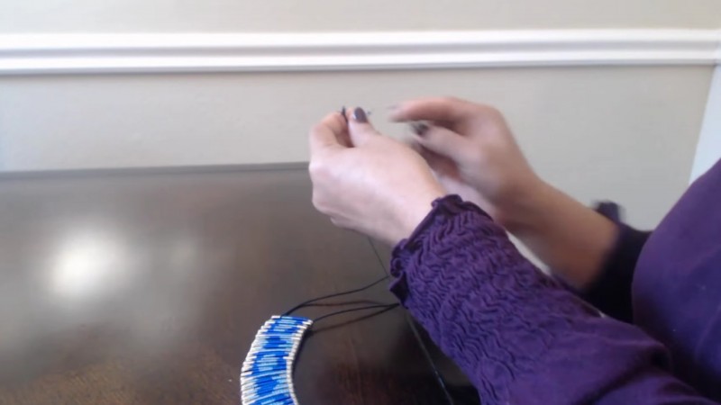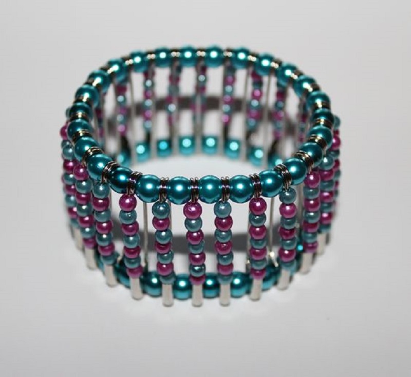 5. Para que el brazalete quede atractivo, posiciona los alfileres de esta manera y pásales el elástico por los orificios.