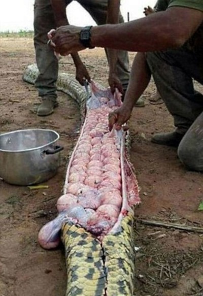¡Al abrir el reptil, la gente vio que su vientre estaba llena de un montón de huevos! La serpiente se preparaba para traer nuevas crías al mundo.