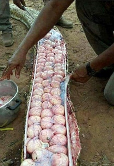 ¡Al abrir el reptil, la gente vio que su vientre estaba llena de un montón de huevos! La serpiente se preparaba para traer nuevas crías al mundo.