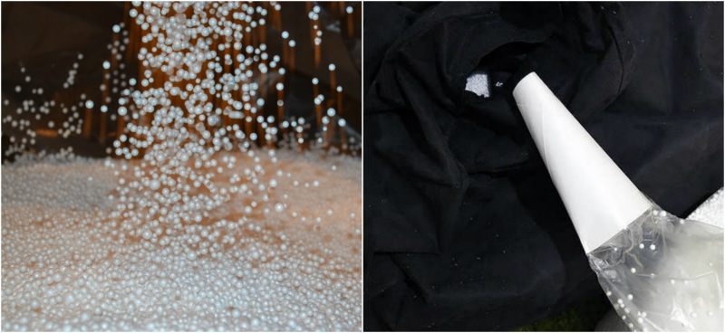 6. Cuando ambas cubiertas estén listas, puedes llenar la bolsa de espuma de poliestireno. Es un momento crucial, ya que las pequeñas bolas suelen desmoronarse, se adhieren a todas las superficies, ¡y es extremadamente difícil recogerlas!