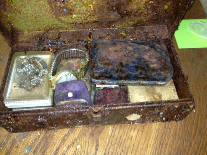 El interior de la caja fuerte se veía muy impresentable. Hace algún tiempo atrás, la tubería de la casa se filtró, y la bóveda secreta no se salvó de esto.