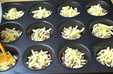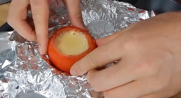 3. Coloca los tomates en moldes para hacer pasteles, cubriéndolos con papel de aluminio. Hornéalos a una temperatura de 220-230°C, hasta que los huevos estén cocidos (aproximadamente unos 20 minutos).