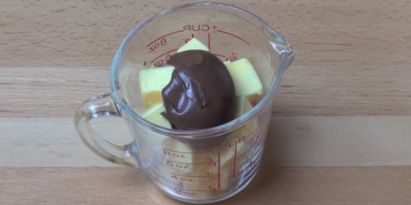 1. Mezcla la mantequilla con una cucharada de «Nutella». Coloca la mezcla en el horno a microondas, la masa tiene que quedar bien derretida.