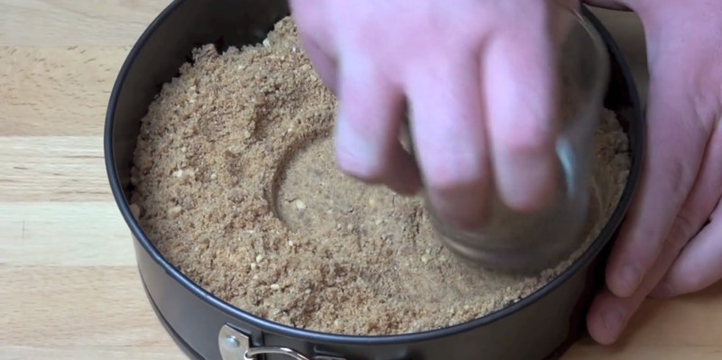 4. Saca del refrigerador la base de la torta de galleta. Hazla uniforme y nivelada con la ayuda de un vaso. Es importante usar una vasija conveniente para que la torta obtenga buena forma.