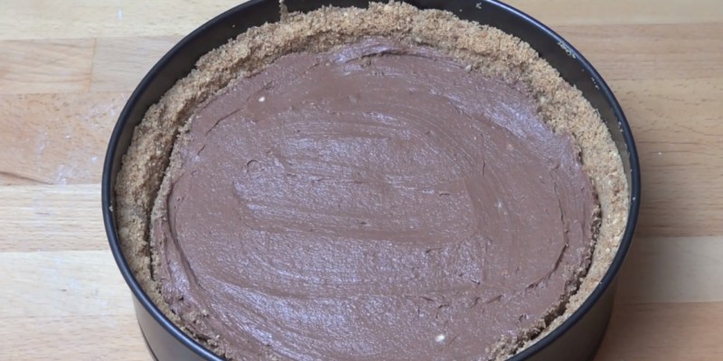 5. Pon encima de la base de galleta la masa de queso y «Nutella». Haz que la parte superior de la torta esté uniforme, esparciendo la mezcla delicadamente. Déjala reposar un par de minutos, pues la torta debe de impregnarse.