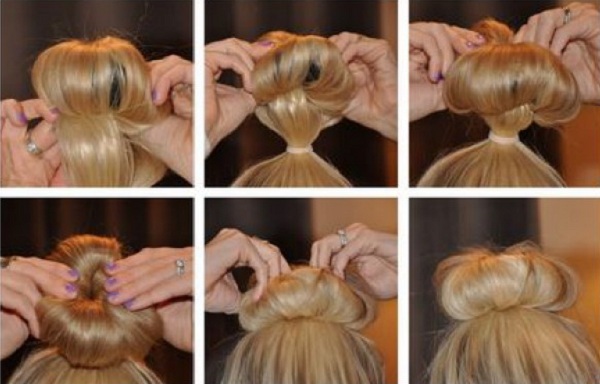 Para empezar, haz una goma para el cabello. Para ello, córtale la punta a un calcetín y enróscalo de esta manera. Luego debes recoger tu cabello en una coleta alta, y colocar la goma en el extremo de tus cabellos. Sujeta con tus dedos las puntas de tu cabello, y comienza a girar la goma-calcetín, enroscando el cabello en ella. Una vez, todo enroscado, distribuye los mechones de manera uniforme, de modo que cubran todo el calcetín, y fija el peinado con laca.