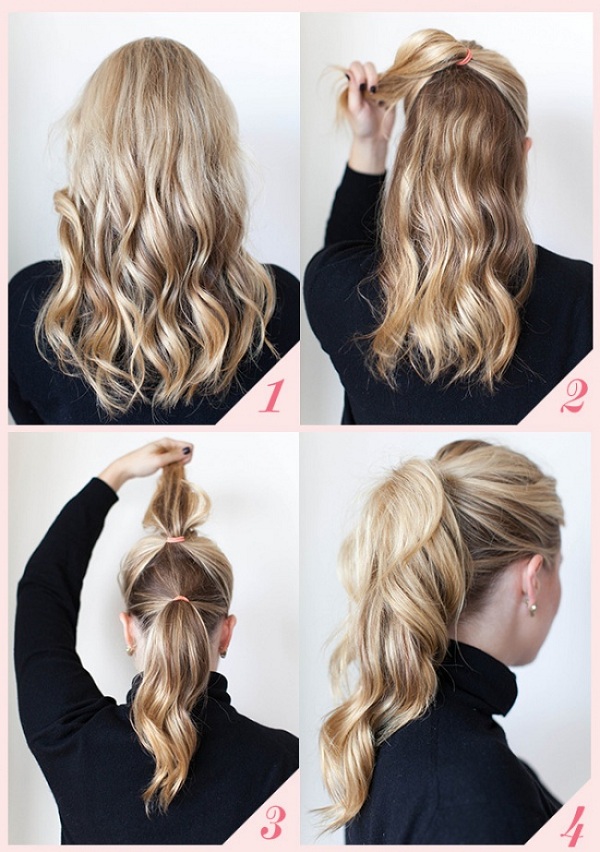 Divide tu cabello en dos partes (superior e inferior). Haz de la parte superior una cola, mantenla elevada. El resto de tu cabello recógelo en una coleta, en la nuca.