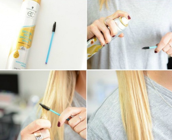 Si deseas tener un pelo perfectamente liso, aplica un poco de spray de laca sobre un cepillo de rímel, o un cepillo de dientes, que ya no utilices. Luego espárcelo a lo largo de tus desobedientes cabellos. El efecto será fantástico.