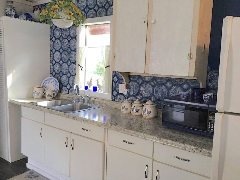 Toda la casa está decorada en el mismo estilo retro. Una vez dentro, se puede apreciar la hermosa combinación de los tonos azul y blanco. ¡Inmediatamente te das cuenta que se trata de una casa creada con amor!