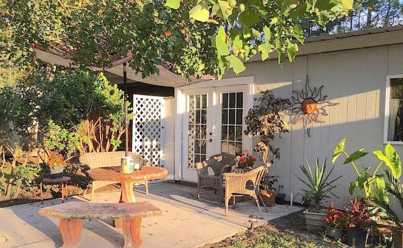 Fuera de la casa, encontrarás un patio muy acogedor, donde puedes descansar cómodamente, en sillas de mimbre, a la sombra de frondosos árboles.