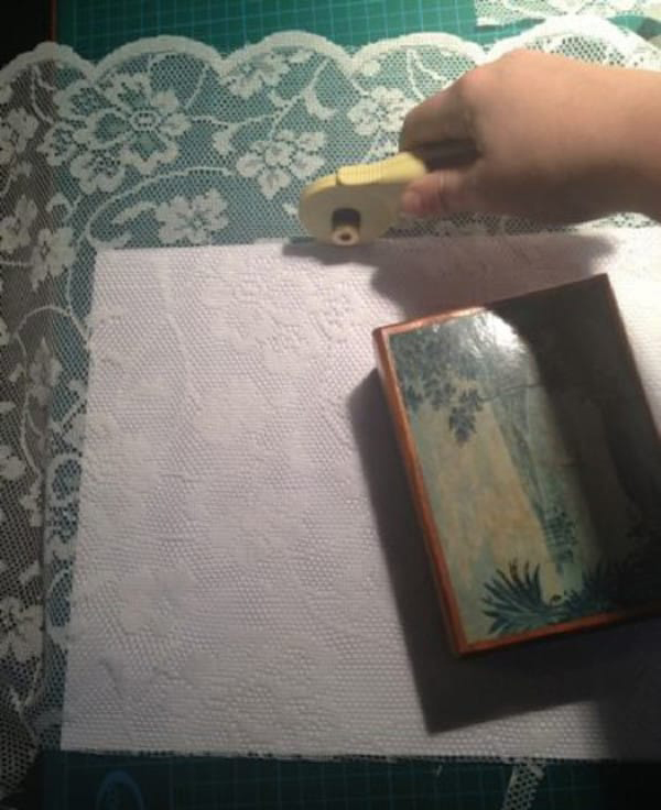4. Antes de que se seque la maicena, pega el encaje en el cristal.